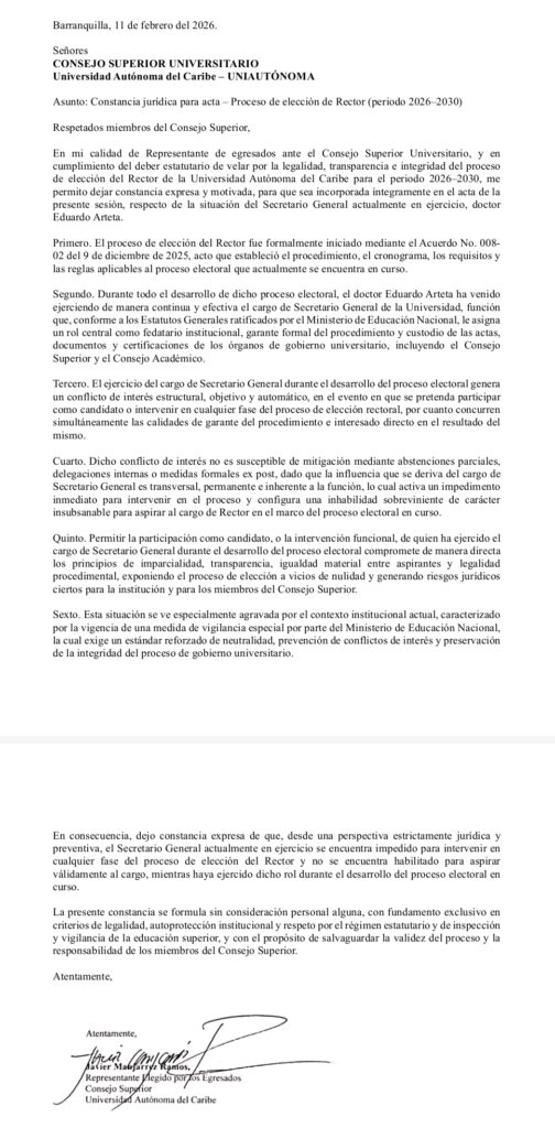 En la antesala de una de las decisiones más trascendentales para la Universidad Autónoma del Caribe, dos cartas radicadas el 11 de febrero de 2026, que fueron filtradas a Hora en Punto, encendieron las alarmas jurídicas sobre el proceso de elección del Rector para el periodo 2026–2030.