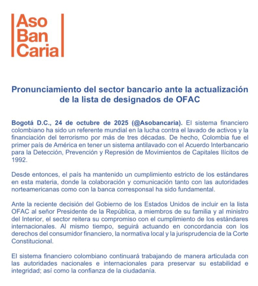 “Ante la reciente decisión del Gobierno de los Estados Unidos de incluir en la lista OFAC al señor Presidente de la República, a miembros de su familia y al ministro del Interior, el sector reitera su compromiso con el cumplimiento de los estándares internacionales. Al mismo tiempo, seguirá actuando en concordancia con los derechos del consumidor financiero, la normativa local y la jurisprudencia de la Corte Constitucional”, manifiesta la Asobancaria en un comunicado.