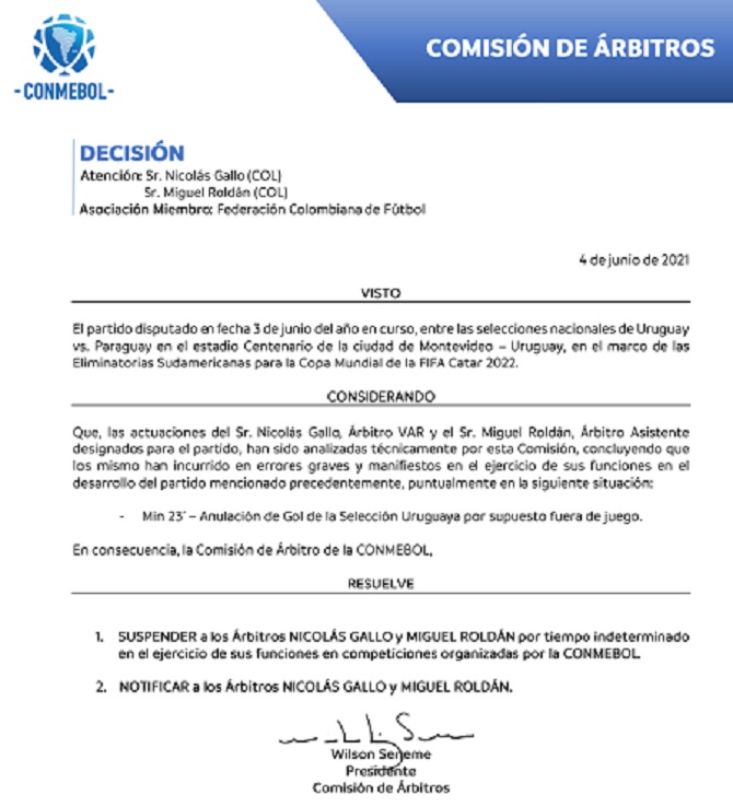 La Confederación Sudamericana de Fútbol, Conmebol, suspendió a los árbitros colombianos Miguel Roldán y Nicolás Gallo tras polémico arbitraje en el partido de Uruguay contra Paraguay en la séptima jornada de la Eliminatoria Sudamericana.