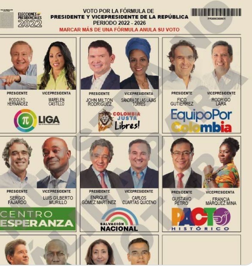 El orden de los candidatos que aparecen en la tarjeta electoral, se definió en un sorteo público. El sorteo se realizó ante los medios de comunicación y fue transmitido por las redes de la Registraduría.