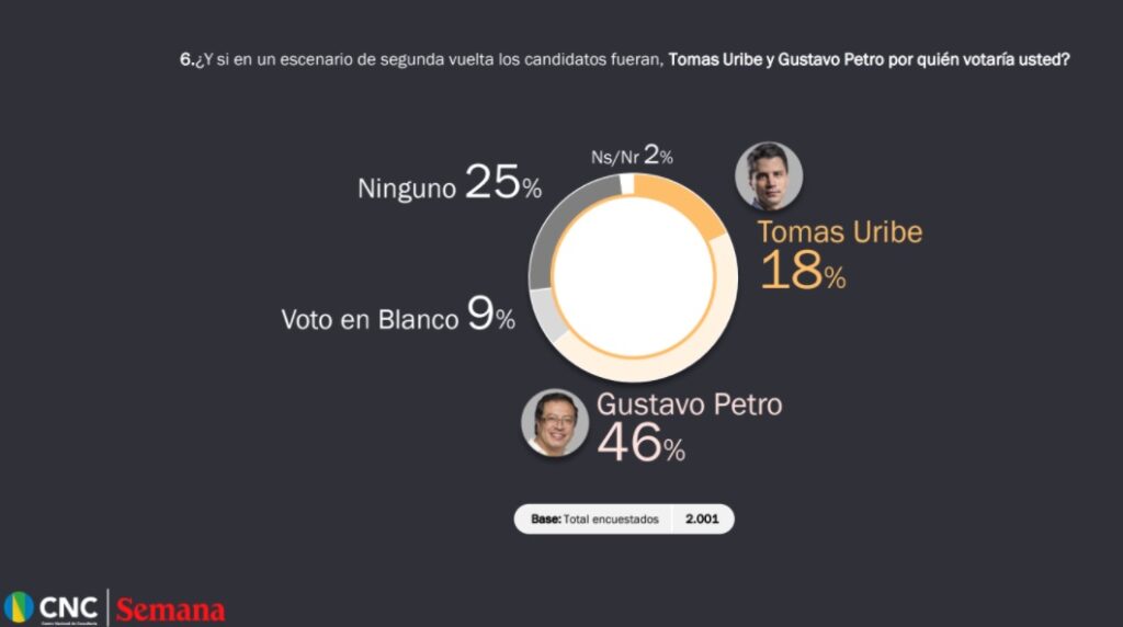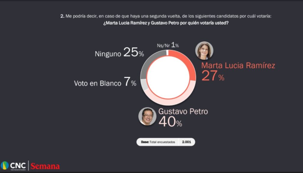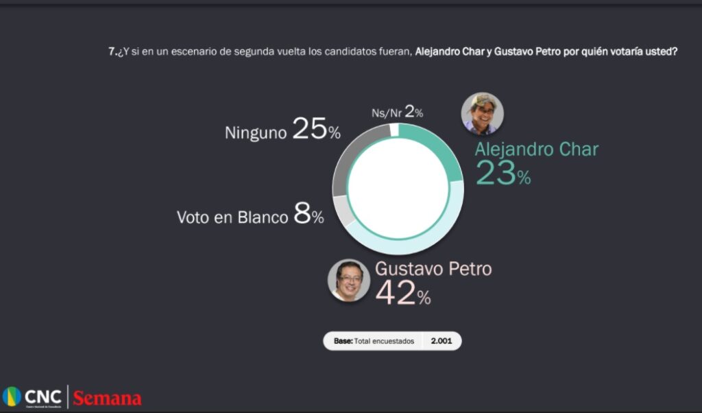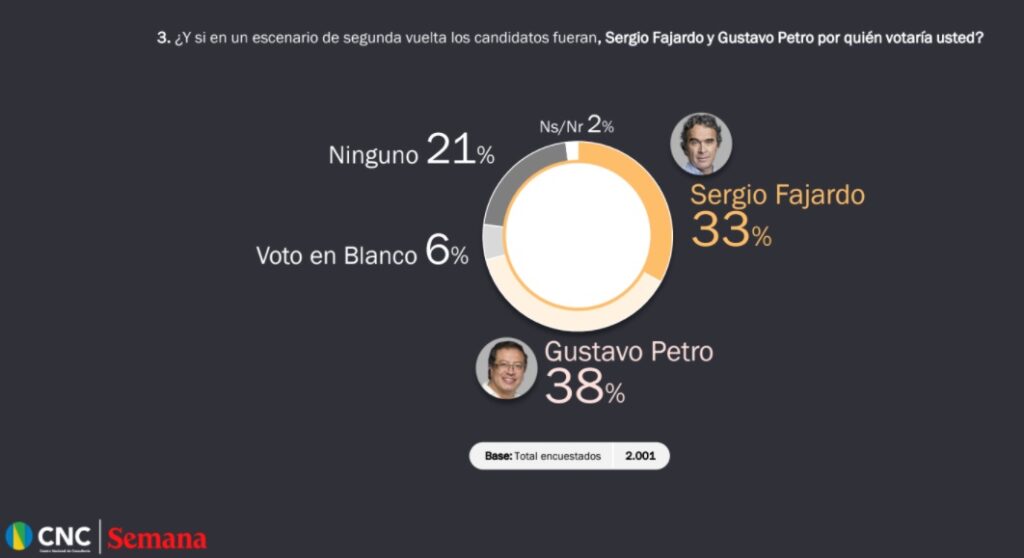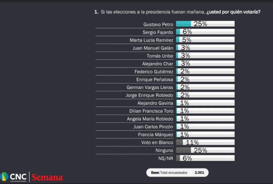 Uno de los marcadores más llamativos que arrojó la encuesta, es la refrendación de la favorabilidad del Senador Gustavo Petro en la preferencia de los electores para la presidencia de la república. Si las elecciones fueran hoy en Colombia, en medio de la peor crisis social y económica, el presidente sería Gustavo Petro, según los resultados de la más reciente encuesta Semana, realizada por el Centro Nacional de Consultoría.