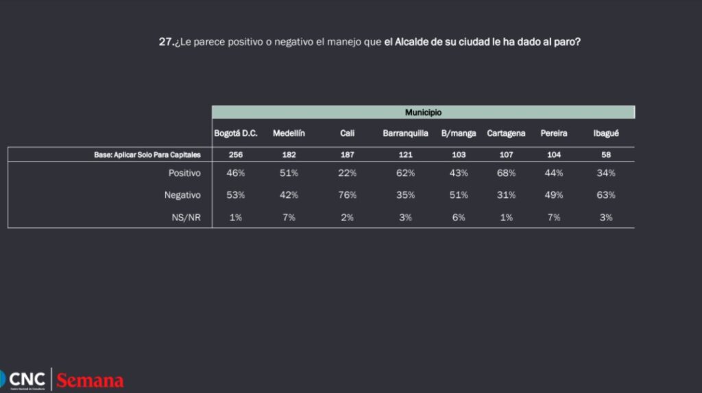 La Revista Semana, a través del Centro Nacional de Consultoría, realizó una encuesta con el propósito de tomarle el pulso político al país sopesando la imagen de los candidatos presidenciales; su intención de voto; favorabilidad y diversos aspectos sobre el paro nacional. Así mismo, la encuesta indagó por la favorabilidad de los ciudadanos en torno a sus alcaldes, teniendo en cuenta la forma en que estos han manejado las protestas en sus ciudades.