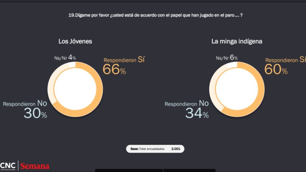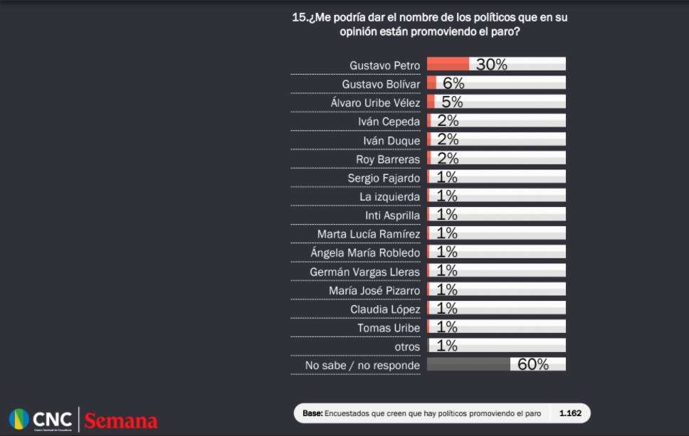 La encuesta arroja cifras interesantes en cuanto al paro nacional. El 30 por ciento de los encuestados creen que Gustavo Petro es el máximo promotor del paro y el 66 por ciento avala la actitud de los estudiantes con la protesta nacional.