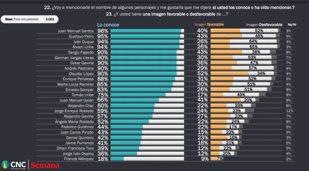 Por otra parte Gustavo Petro, con el 43% y Juan Manuel Santos con el 40%, son los políticos con la imagen más favorable en el país, mientras que Iván Duque solo tiene un 24 por ciento de favorabilidad contra un 65% de imagen negativa. Álvaro Uribe tiene la misma favorabilidad que Duque (24%) pero le gana en imagen desfavorable, que ahora le llega a su nivel más alto en los últimos años, en un 65% de desfavorabilidad.