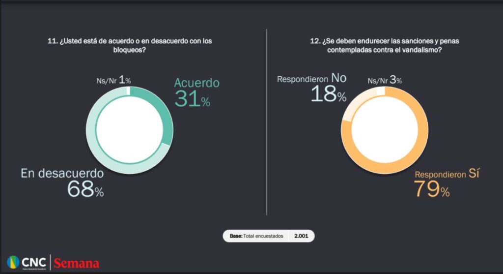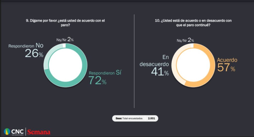 El 72 por ciento de los colombianos manifestaron estar de acuerdo con el paro, pero el 68 por ciento dijo no estar de acuerdos con los bloqueos y actos vandálicos. Más del 70 por ciento cree que las malas acciones policiales son ocasionadas por casos aislados de la institución y no en general por la fuerza policial y hay un 57 por ciento que desea que el paro continúe.
