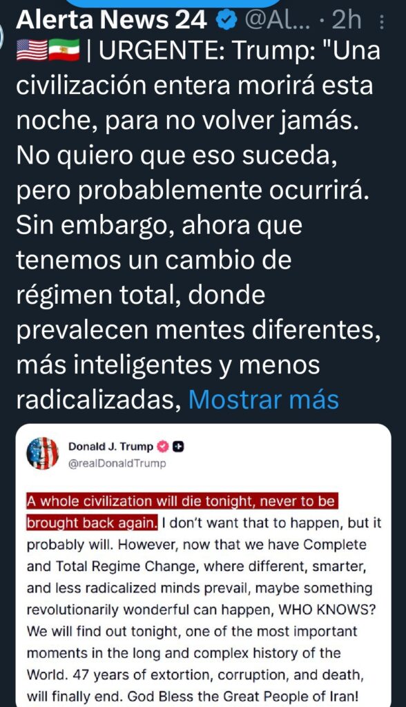 - Trump amenaza con desaparecer a «toda una civilización» si Irán no acepta un acuerdo para reabrir el estrecho de Ormuz y culminar la guerra, iniciada por Israel y EE. UU. hace más de un mes.