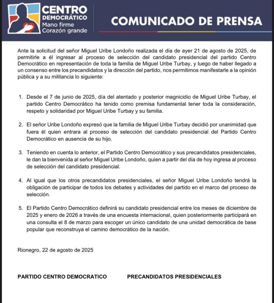 “El señor Uribe Londoño expresó que la familia de Miguel Uribe Turbay decidió por unanimidad que fuera él quien entrara al proceso de selección del candidato presidencial del Partido Centro Democrático en ausencia de su hijo“, se lee en el documento firmado por el partido y sus precandidatos desde el municipio antioqueño de Rionegro, donde vive Uribe Vélez.
