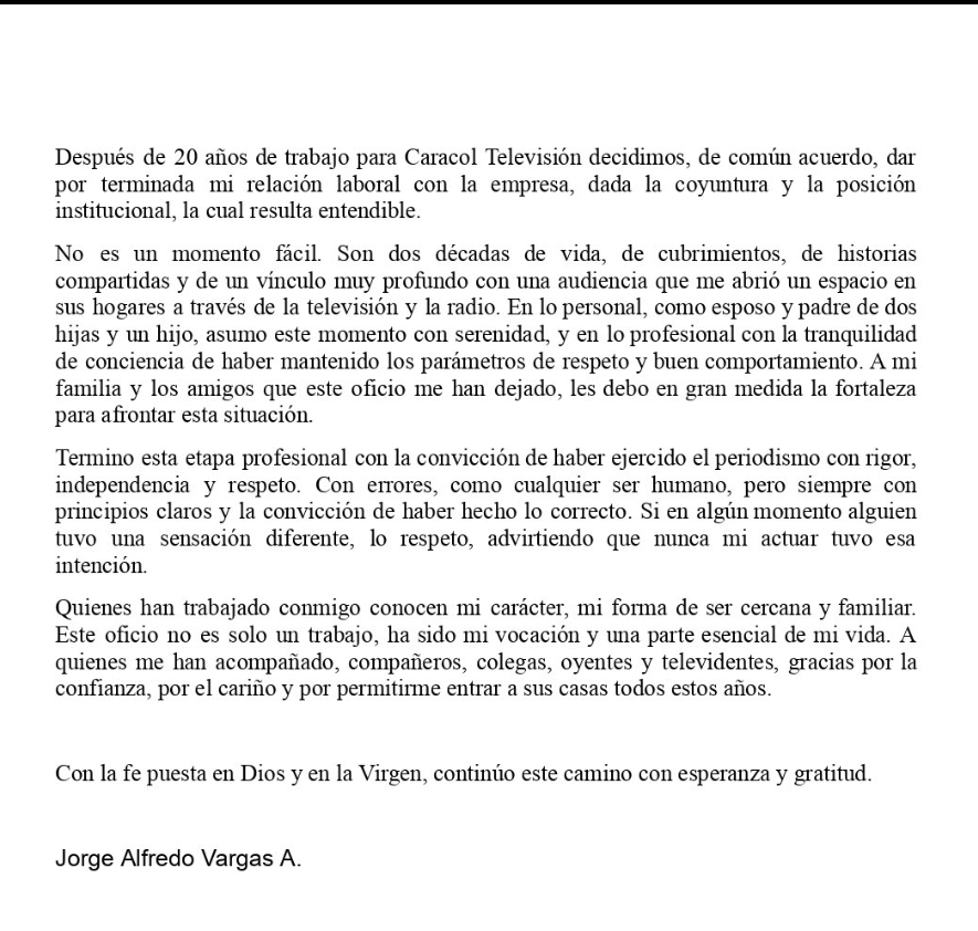 En su primer pronunciamiento público desde el viernes, cuando estalló el escándalo por presuntos hechos de acoso sexual en el canal Caracol, que terminaron sacándolo de su cargo, el presentador y periodista Jorge Alfredo Vargas habló de los graves señalamientos en su contra.