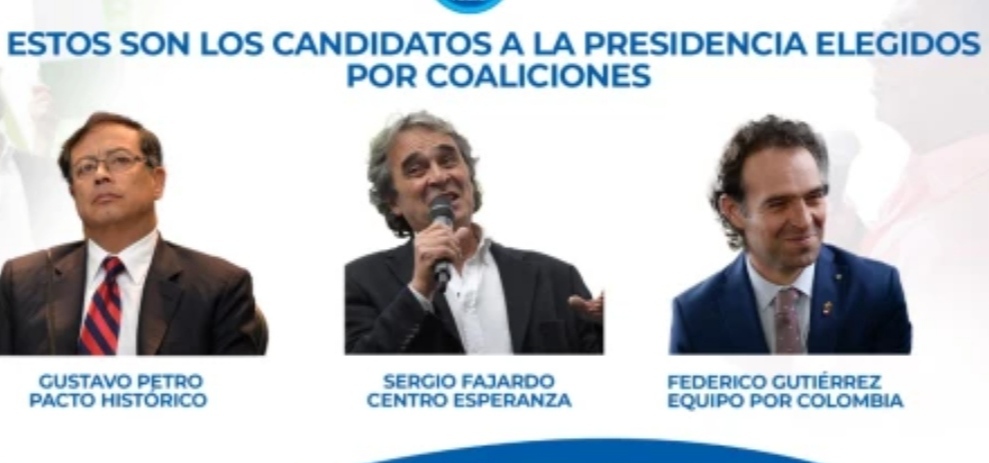 Gustavo Petro, Federico Gutiérrez y Sergio Fajardo ganaron las consultas de las coaliciones Pacto Histórico, Equipo por Colombia y Centro Esperanza, respectivamente, efectuadas este domingo. De acuerdo con el boletín 18 de la Registraduría, Petro alcanzaba 3.378.815 votos, Gutiérrez obtenía 1.620.493 sufragios y Fajardo 548.194.