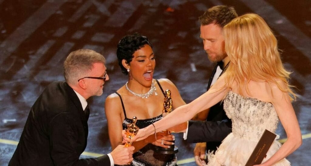 En la categoría de actuación de reparto, las estatuillas fueron para Amy Madigan como mejor actriz secundaria en “Weapons” y Sean Penn como mejor actor secundairio en “One Battle After Another”.