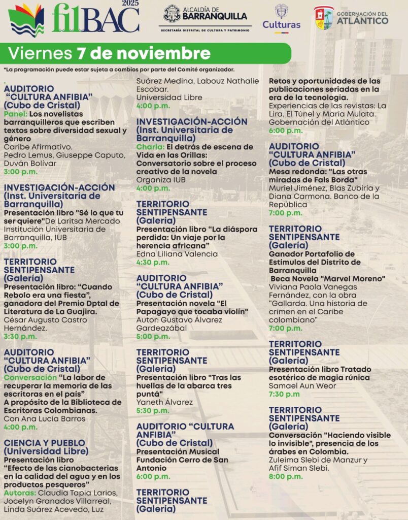 La fiesta de las letras en Barranquilla no se detiene. Con una programación excelsa en el tercer día de la FILBAC 2025, este viernes 7 de noviembre, para el deleite de la ciudadanía y los amantes de la literatura.