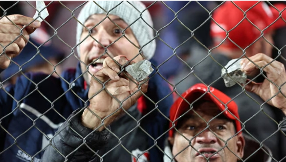 Las imágenes de aficionados visitantes mostrando largos palos (algunos parecían varas de metal) se acumulaban con la de simpatizantes locales que mostraban las piedras que, señalaban, caían desde la tribuna alta. También cayeron asientos, “baldones, palos, mampostería e inodoros completos”, según la agencia EFE, y hasta una bomba de estruendo, de acuerdo con periodistas que estaban en el campo de juego cubriendo las acciones del partido.